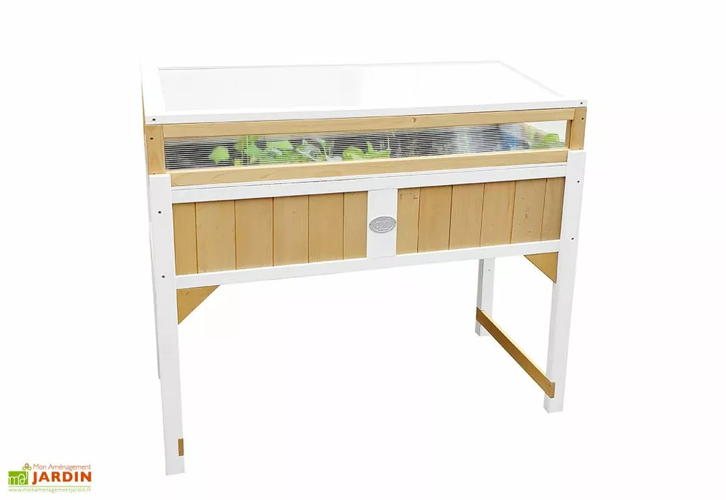 Cette serre sur pieds comprend un bac de culture en bois et des parois en polycarbonate de 4 mm d’épaisseur. Le bois utilisé, du hemlock, est naturellement imputrescible, ce qui signifie qu’il résistera parfaitement à l’humidité, à la moisissure et aux insectes xylophages qui auraient pu le détériorer, le tout sans nécessiter de traitement ou d’entretien. Ce bois est même certifié FSC, un label qui indique qu’il provient de forêts gérées dans le respect de l’environnement.