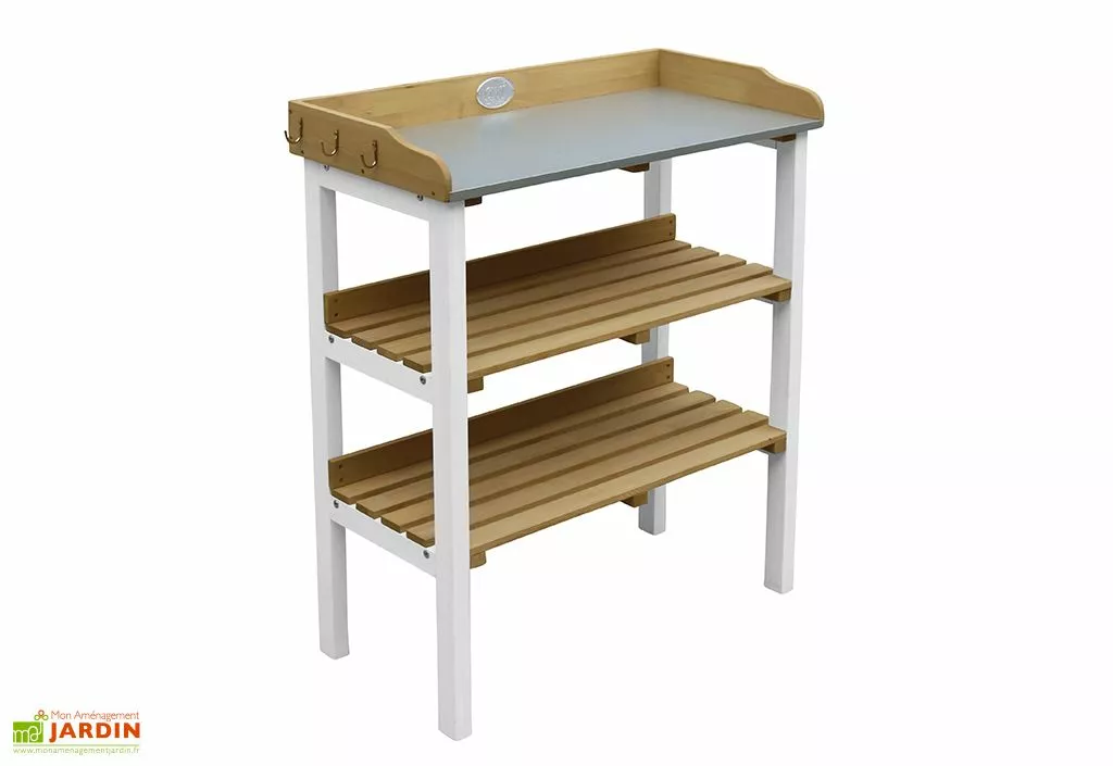 Cette table de rempotage signée Axi trouvera parfaitement sa place sur un balcon, dans un jardin ou dans une petite serre. Elle ne mesure en effet que 76 cm de long sur 37 cm de profondeur et 91,5 cm de haut, ce qui lui permet de n’occuper que peu d’espace. Elle se compose d’une structure en bois et d’un plan de travail en métal zingué, le tout complété par deux étagères sur lesquelles vous pourrez poser vos plants ou des sacs de terreau, par exemple. A noter également, la présence de crochets auxquels accrocher vos outils de jardinage.