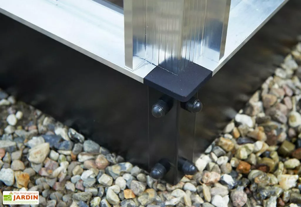 La base en acier galvanisé permet de fixer la serre directement sur la terre, sans passer par la création d’une dalle de béton. Elle permet également de faciliter son installation, de rehausser la structure de 12 cm, de stabiliser et de renforcer l’intégralité de l’armature. Elle permet également de supporter le poids du vitrage pour éviter la déformation.