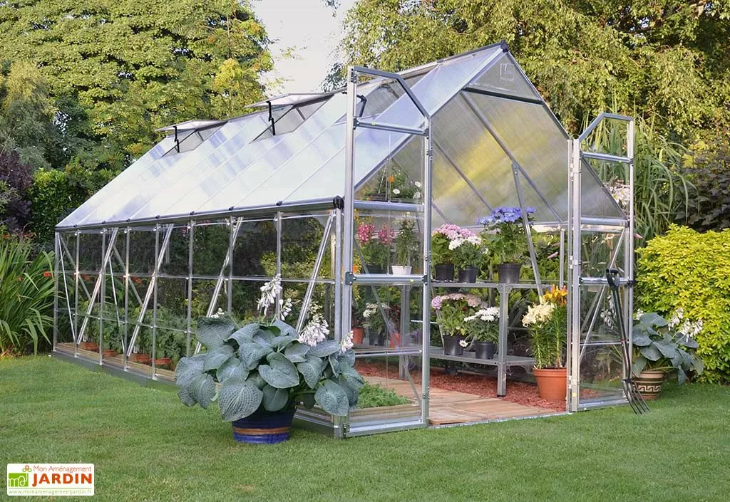La serre est constituée d’une structure en aluminium peinte par poudrage gris silver, parfaitement insensible à la corrosion. Ses parois sont constituées, quant à elles, de plaques de polycarbonate cristallin de 0,7 mm offrant une transmission lumineuse de 90% et sa toiture de plaques de polycarbonate double paroi de 4 mm diffusant 70% de la lumière. Le polycarbonate est pratiquement incassable et traité contre les UV : les plaques bloquent les UV tout en étant protégées du jaunissement et de la fragilisation dus au soleil.