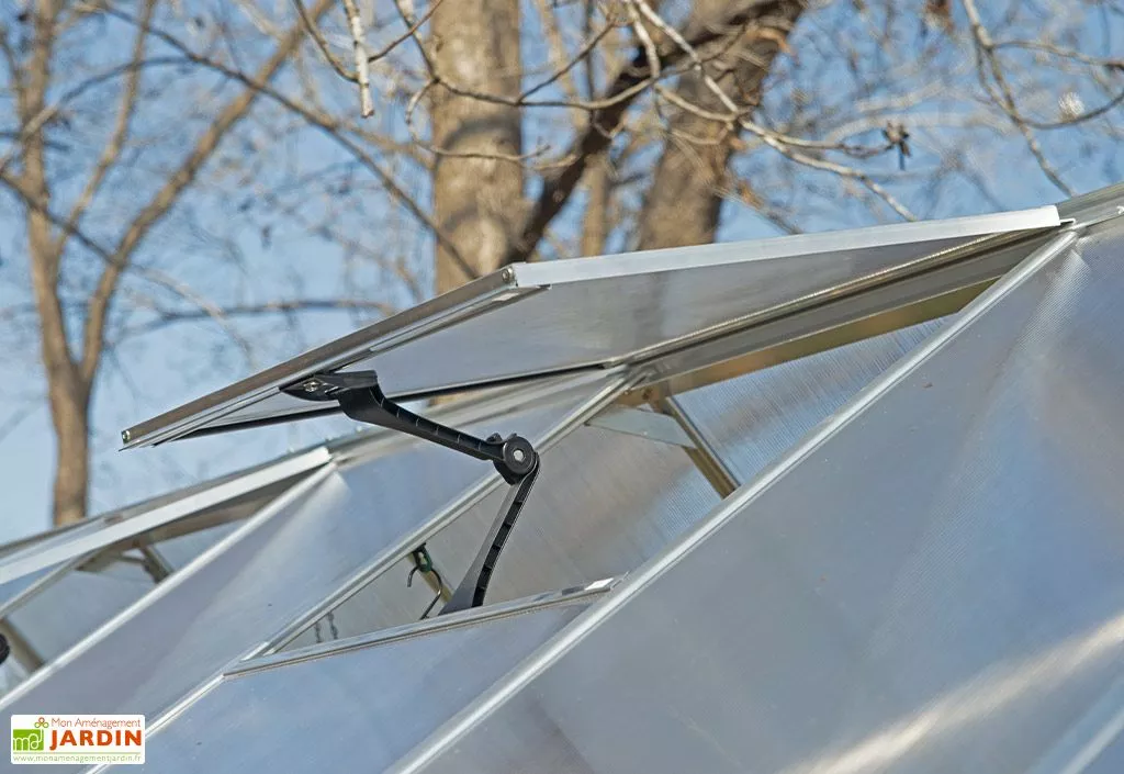 Des lucarnes présentes sur la toiture permettent d’aérer l’intérieur de la serre pour contrôler facilement la température et le taux d’humidité. Vous en trouverez 1 sur le modèle de 6,03 m², 2 sur le modèle de 8,95 m², 3 sur le modèle de 11,88 m² et 4 sur le modèle de 14,81 m².