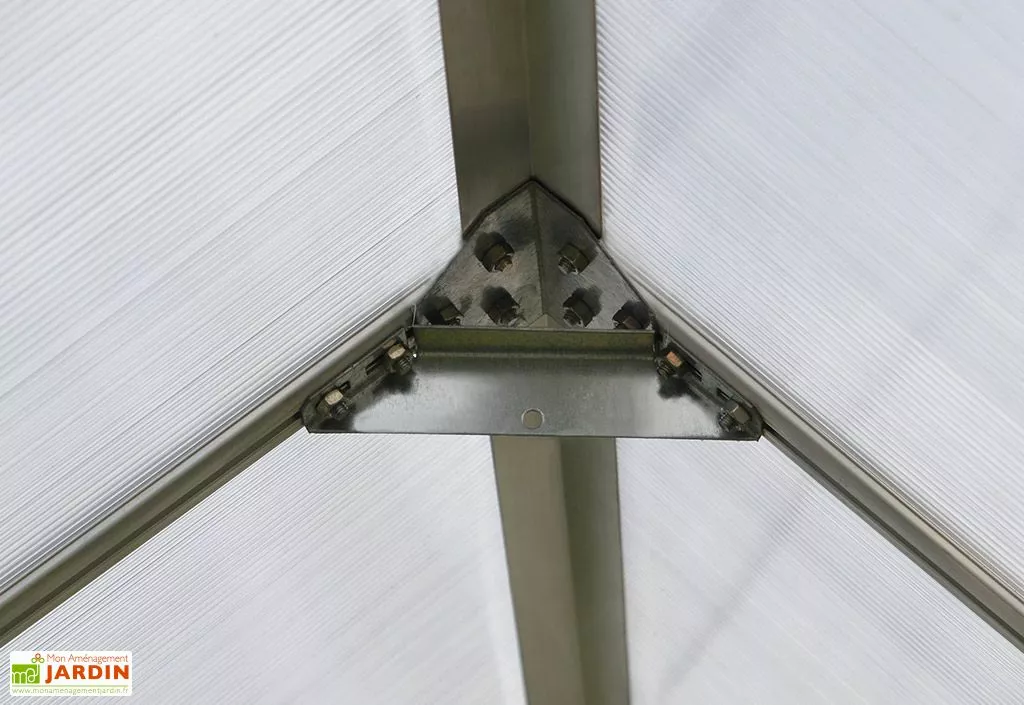 Les parois de la serre de jardin Essence sont fabriqués en polycarbonate. Ces panneaux, en plus d’être quasi incassables, sont transparents et laissent passer plus de 80% de la lumière du soleil. L’intérieur de la serre sera donc bien lumineux, mais l’un des avantages de ce polycarbonate repose sur sa capacité à filtrer les rayons UV. Cette protection permet d’éviter le jaunissement ou la décoloration des panneaux.