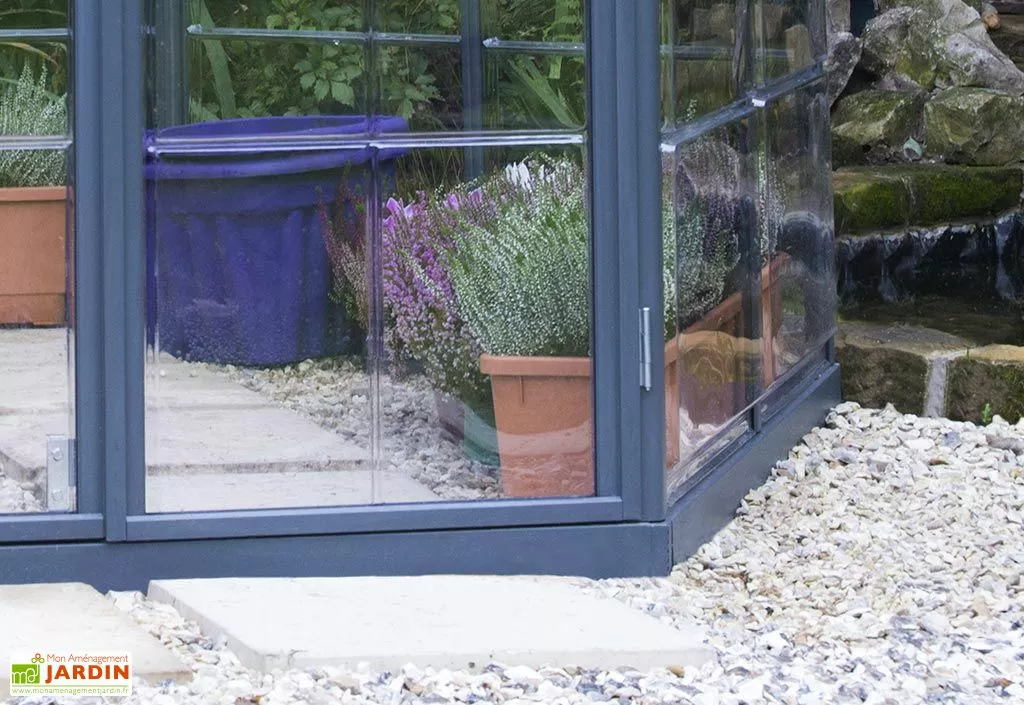 Cette serre s’est en effet vue dotée d’une structure en aluminium, un métal léger mais résistant, ici laqué en gris. Cette structure accueille des parois et une toiture composées de panneaux de polycarbonate (4 mm d’épaisseur pour la toiture, 0,7 mm pour les parois latérales). Le polycarbonate présente de nombreux avantages, dont le fait d’être pratiquement incassable tout en étant flexible et transparent.