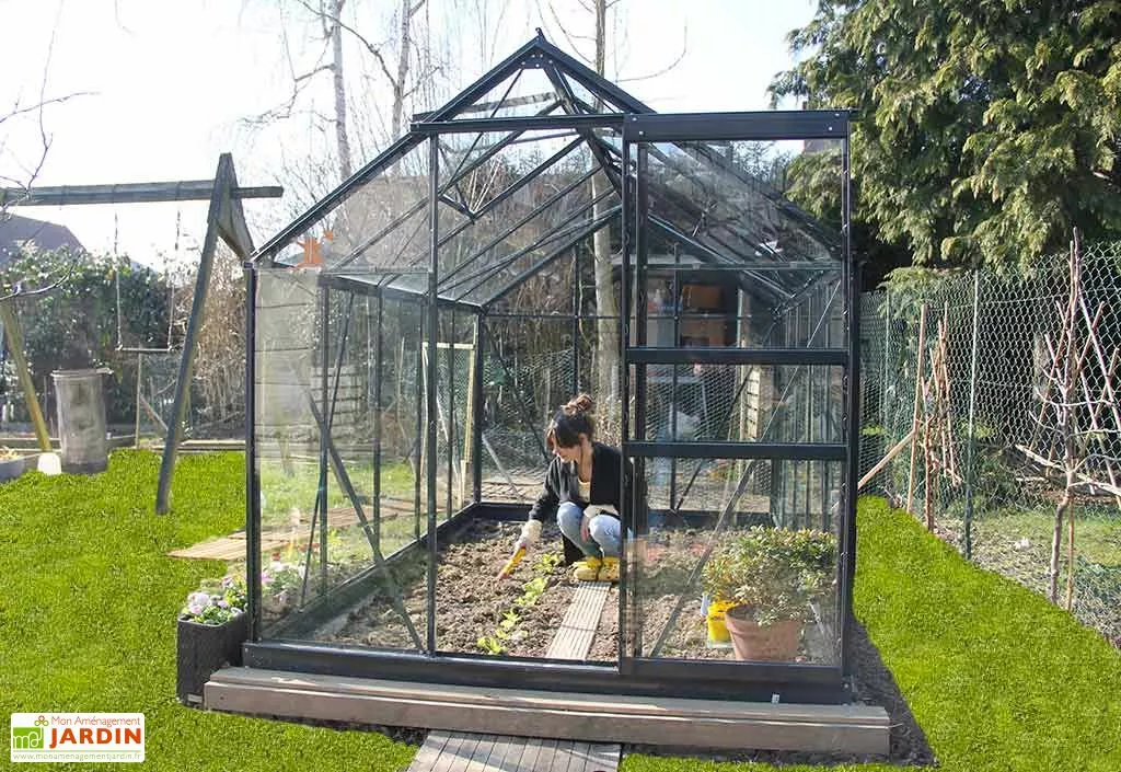 Cette serre de jardin Chalet-Jardin dispose d’une structure conçue en aluminium de 1,1 mm d’épaisseur et des parois en verre trempé d’une épaisseur de 4 mm. Le tout repose sur une base en acier galvanisé de 10 cm de haut qui, tout comme l’armature de la serre, est laqué en gris. Cette serre affiche des dimensions de 186 x 310 x 190 cm. Vous aurez donc à votre disposition une surface de près de 6 m².
