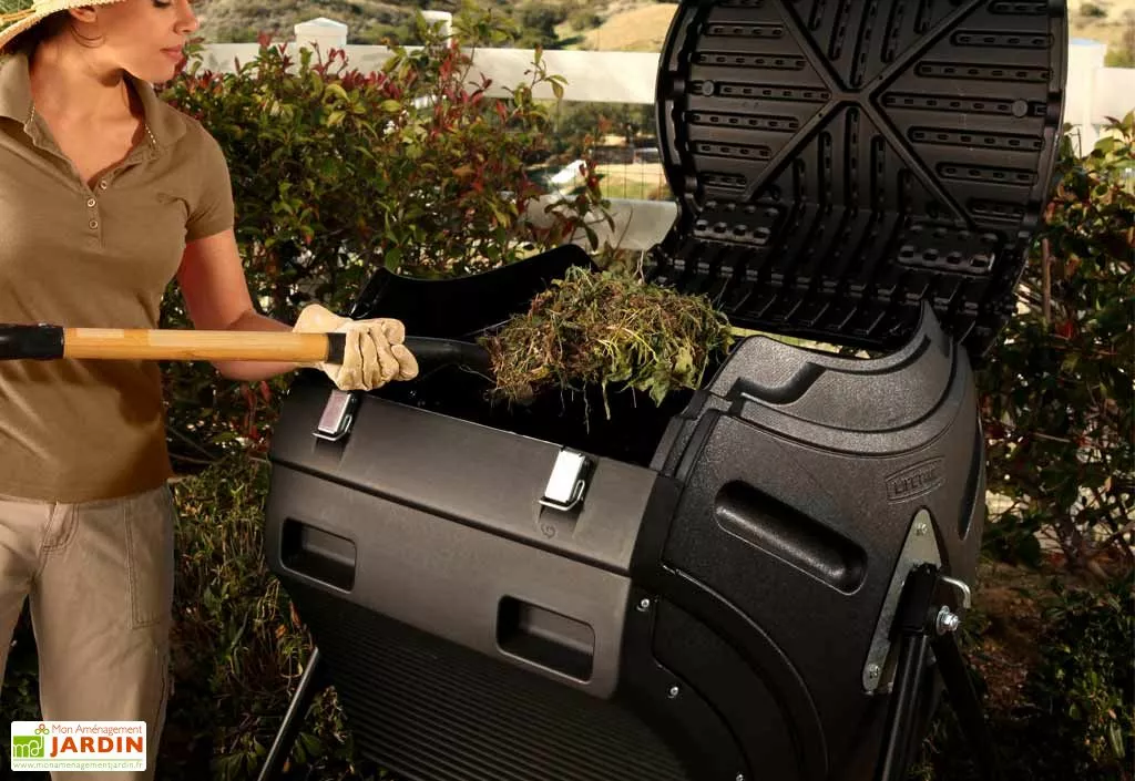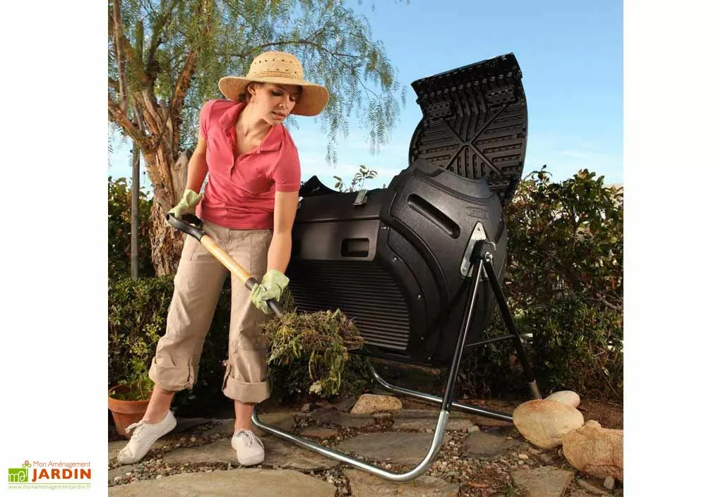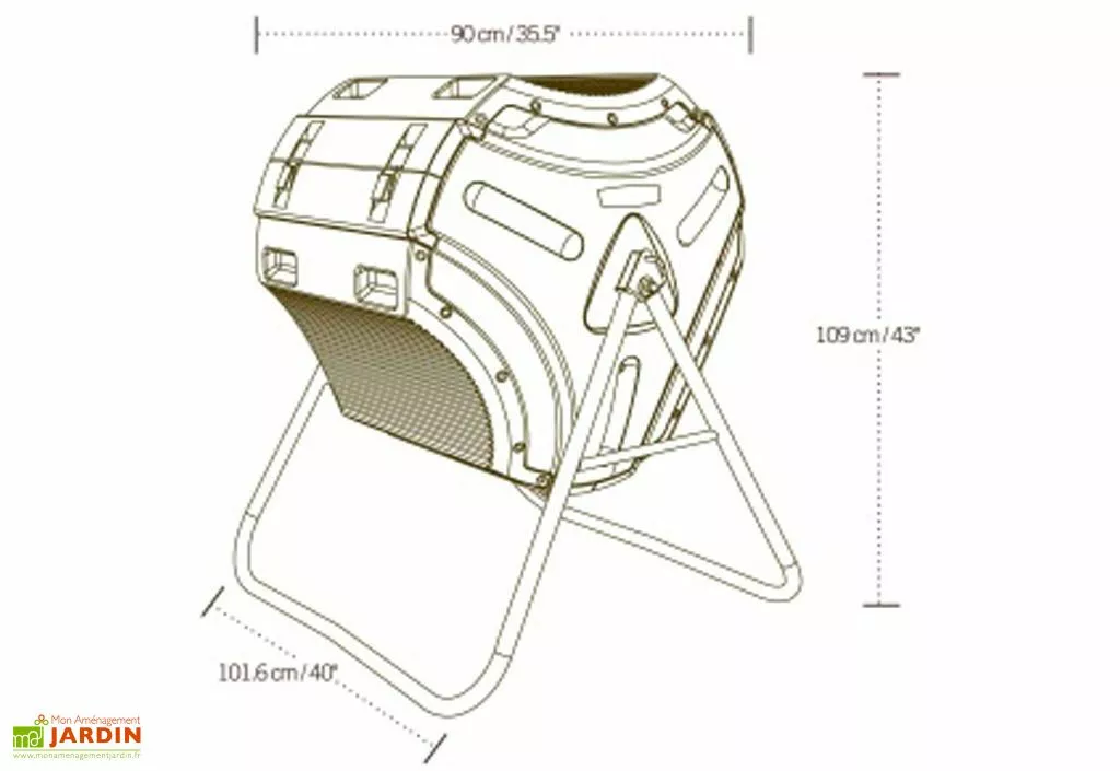 Le composteur rotatif de chez Lifetime de 303 L est en polyéthylène haute densité avec double parois. Sa matière lui confère une grande longévité et permet de retenir la chaleur. Ses dimensions de 1,09 x 0,90 x 1,01 m (l,l,h) offrent un confort optimal et vous évite de vous baisser.