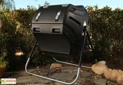 Son tambour tourne sur son axe et peut être bloqué à l’aide d’une broche. La ventilation dans le bac à compost et le mélange sont assurés par des barres de ventilation à l’intérieur. Très pratique, le couvercle est amovible. La structure de votre bac est en acier galvanisé.