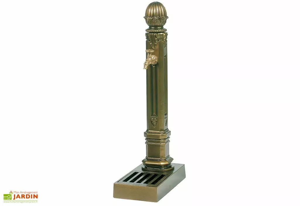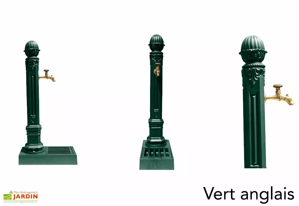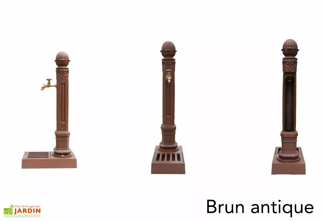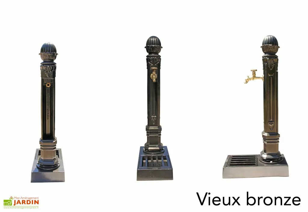 La fontaine de jardin de chez Dommartin est en fonte traitée anticorrosion par thermo-laquage. Elle est coloris vieux bronze et s’intègre facilement dans le jardin. La fontaine dispose d’une vasque et d’un robinet colvert en laiton. Le robinet est livré avec un raccordement pour brancher un tuyau d’arrosage. La fontaine en fonte est extrêmement résistante, utile et décorative.