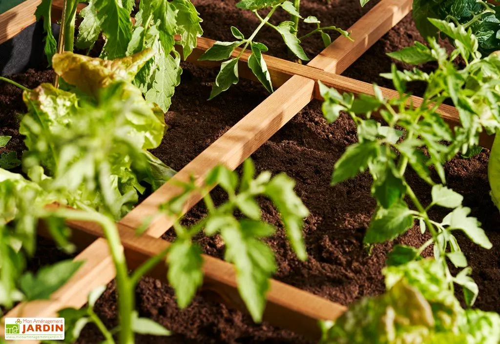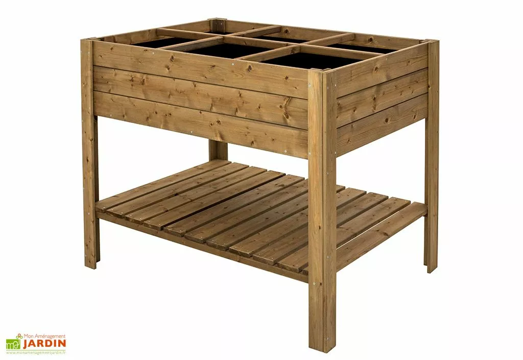 Le carré potager mesure 120 x 80 cm et dispose de 6 séparateurs pour cultiver facilement vos légumes dans des carrés de 36 cm environ. Il est surélevé grâce à des pieds en bois de 58 x 14 mm de section, pour atteindre une hauteur totale de 88 cm. Le bac potager mesure 24 cm de hauteur et le fond est à couvrir avec un géotextile pour 250 litres inclus. Une étagère sous le bac vous permet de stocker vos outils, votre terreau ou d’autres plants.