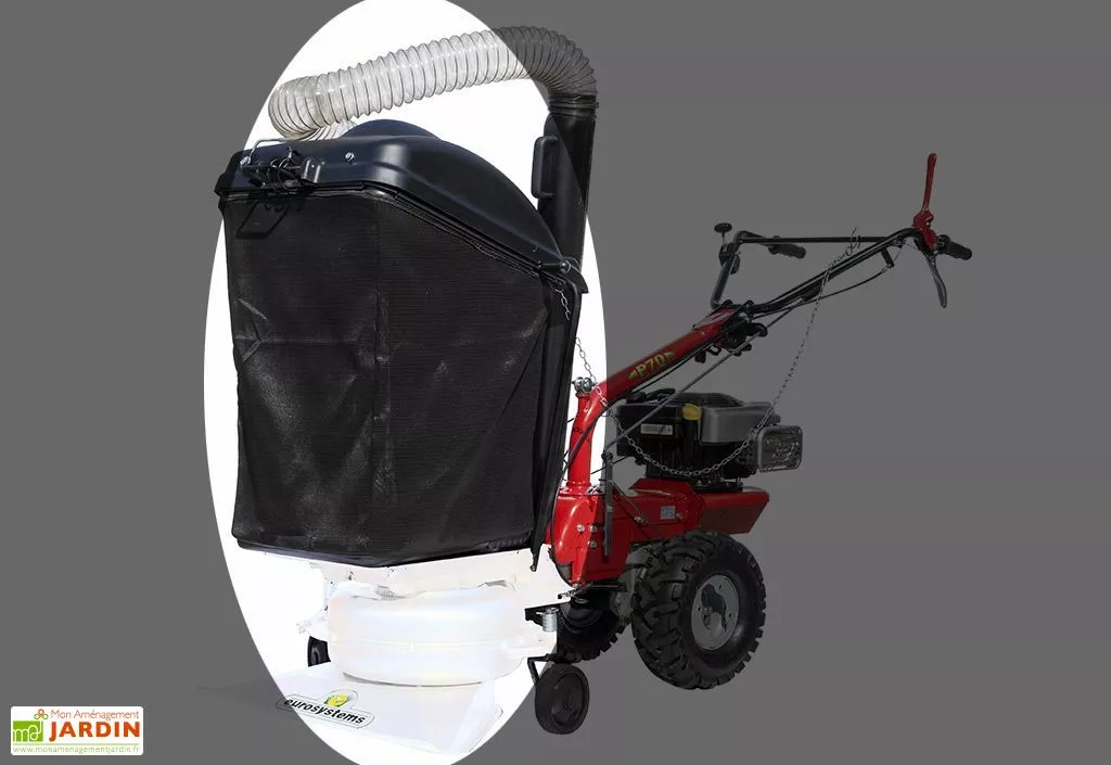 Le kit aspirateur / souffleur s’installe sur le Porte Outils Thermique Multifonctions 190 CC – P70 EVO de chez Eurosystems pour disposer d’un véritable aspirateur thermique d’extérieur et d’un souffleur puissant. La fonction « aspirateur » dispose d’une largeur d’aspiration de 78 cm, de 2600 tours / min, d’une caisse aspirante de 40 cm de diamètre et d’un bac d’une capacité de 185 litres. La vitesse de l’air en sortie de l’aspirateur est de 45 m/sec.
