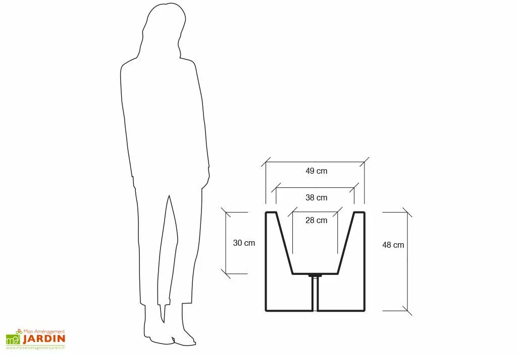 La jardinière carrée est disponible dans de nombreux coloris. Elle possède une contenance de 29,5 litres et ses dimensions intérieures sont de 38 x 28 x 30 cm (l,l,h). Elle se déplace facilement puisqu’elle ne pèse que 7 kg. Ecologique, elle se recycle entièrement.