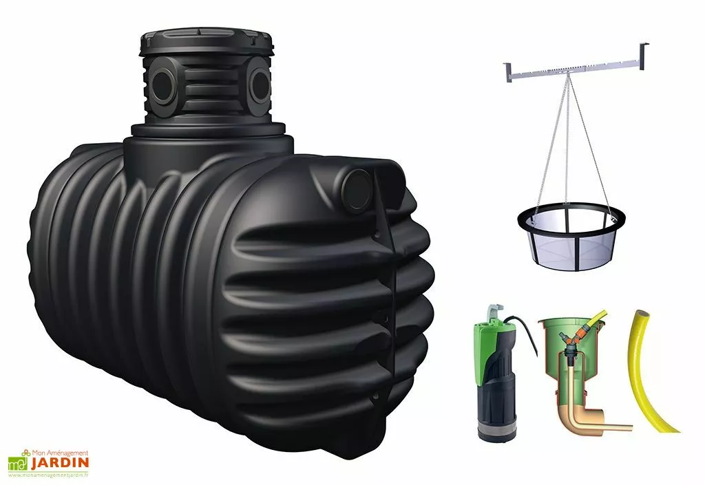 La cuve enterrée de chez Garantia en polyéthylène possède une contenance de 1600 litres et permet de récupérer l’eau de pluie afin d’arroser un jardin de 200 m². Elle est livrée avec un kit complet :