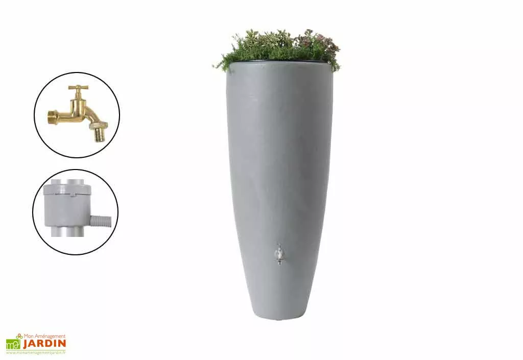 Votre cuve de récupération d’eau de pluie de chez Garantia possède une contenance de 300 litres. Elle est en polyéthylène de couleur grise. D’une hauteur de 1,45 m, votre récupérateur d’eau est 2 en 1 puisqu’il permet aussi de faire pousser des plantes grâce à son support intégré. La cuve possède un encombrement moindre puisqu’avec seulement 62 cm de diamètre elle peut retenir jusqu’à 300 litres d’eau qui vous seront utiles pour arroser votre jardin.