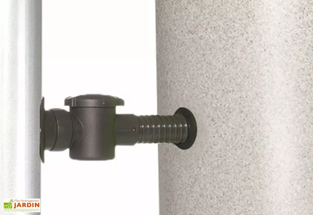 Le collecteur dispose d’une fonction trop-plein automatique, d’une position été/hiver et d’une sortie latérale de 32 mm. Il s’adapte aux gouttières de 80 ou 100 mm de diamètre. La cuve fait 350 litres et est livrée avec son robinet design chromé. Elle est équipée d’un bouchon de vidange afin de faciliter la purge.