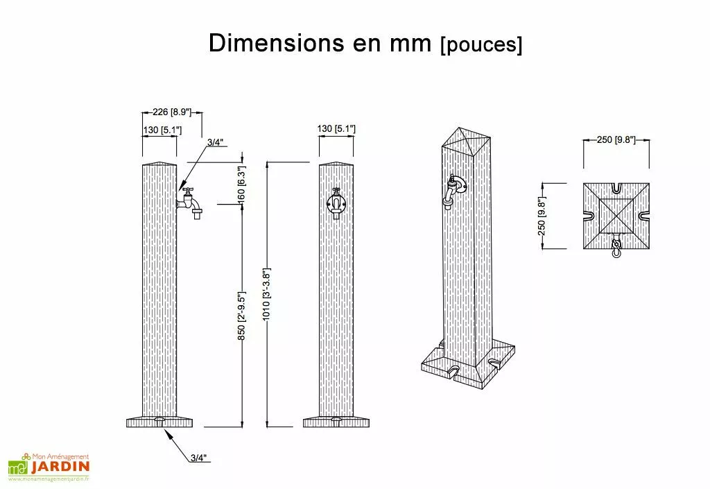 La fontaine de jardin mesure 1 m de hauteur pour 13 cm de côté. Elle est équipée d’une embase de 25 x 25 cm à fixer impérativement dans le béton grâce à 4 points d’ancrage (vis d’ancrage non incluses). Elle est livrée avec son robinet en laiton 3/4″ (19 mm), déjà monté sur la fontaine. Le raccordement 3/4″(19 mm) se situe en bas de la fontaine.