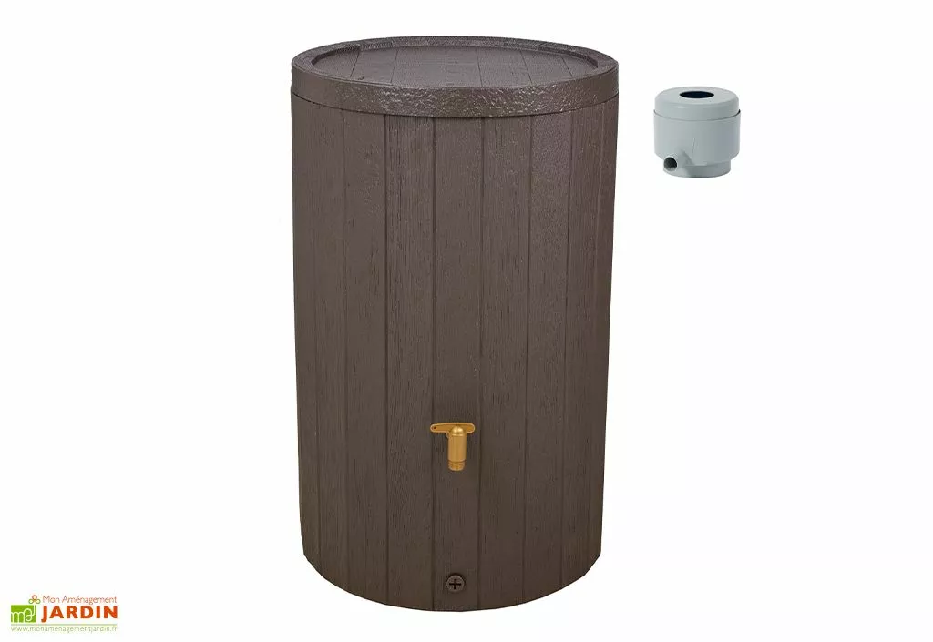 Le récupérateur d’eau dispose de 2 filetages directement moulés sur la cuve pour installer le robinet inclus et pour permettre une vidange totale. Le robinet en polyéthylène imite le laiton pour une belle finition mais aucun entretien. Le joint DN 19/32 est également inclus, il n’est pas installé.