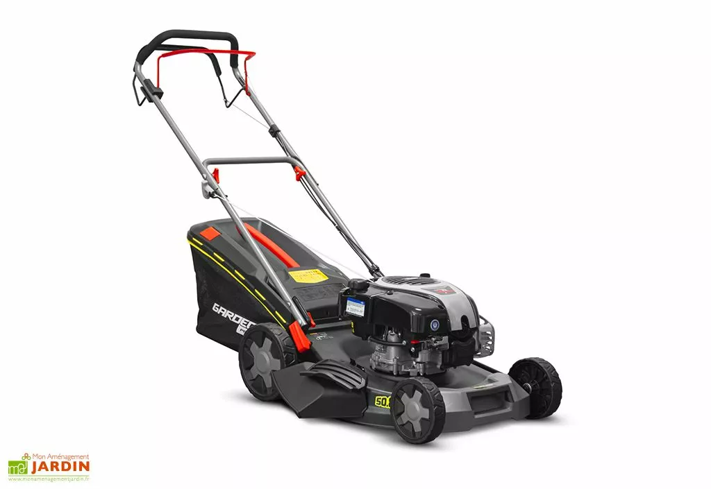 Cette tondeuse thermique autotractée de chez Gardeo Pro permet de tondre des grands terrains de pelouse notamment grâce à sa largeur de coupe de 508 mm. Elle dispose d’un moteur Briggs and Stratton d’une puissance de 161 CC / 2.5 Kw avec une capacité du réservoir d’essence de 1 L, et de 0,6 L pour le réservoir d’huile.