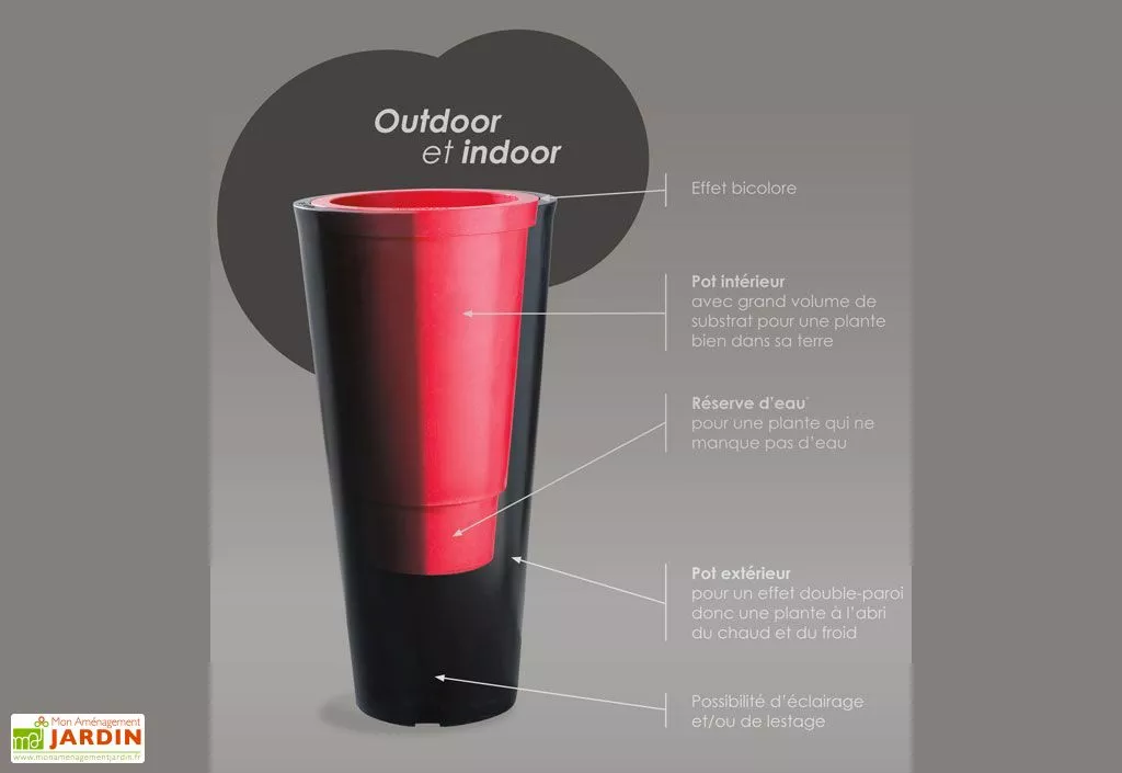 Les pots intérieur et extérieur sont fabriqués en polyéthylène haute densité, un matériau très résistant qui ne craindra ni les chocs, ni les intempéries et autres températures extrêmes. La version double paroi se montrera d’autant plus résistante et offrira également à vos plantes une réserve d’eau de 12 L tout en leur assurant une meilleure isolation. Le pot intérieur dispose lui aussi d’une réserve grâce à la présence d’un double fond et pourra accueillir jusqu’à 91 L de terreau.