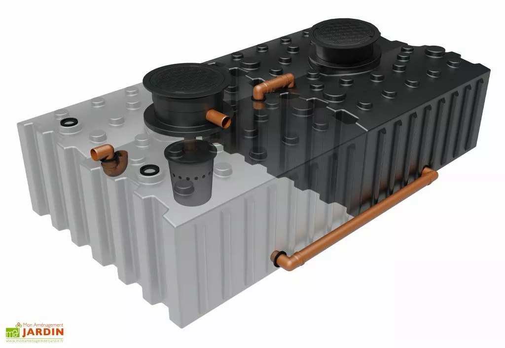 La cuve de récupération, conçue en Allemagne, est fabriquée en polyéthylène et comprend 3 raccords DN 100 pour l’arrivée et l’évacuation de l’eau de pluie. Un système de filtration Biovitor, développé et breveté par GreenLife, est disponible en option.
