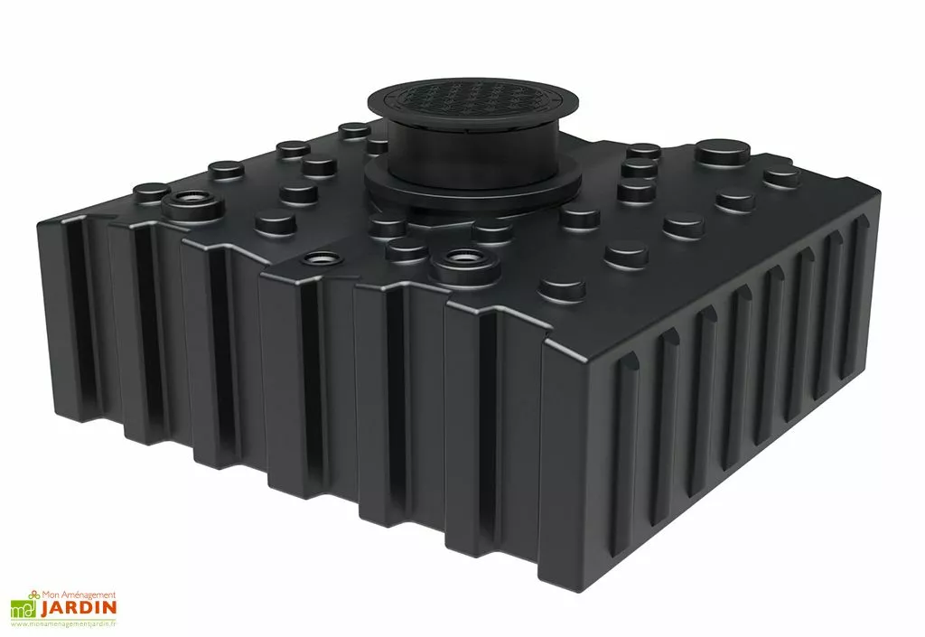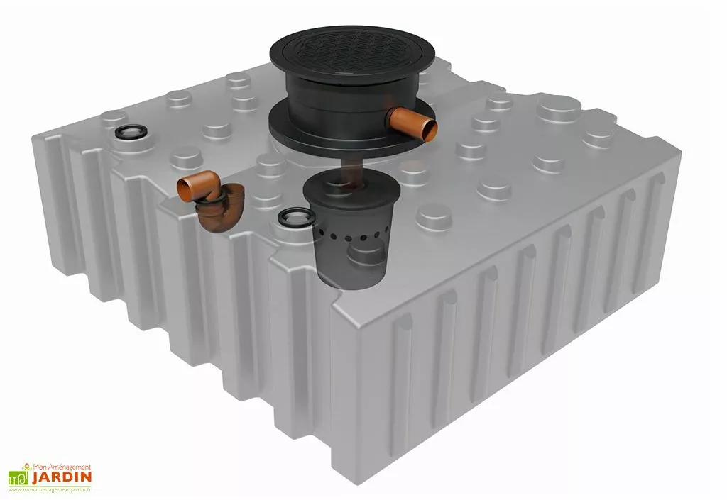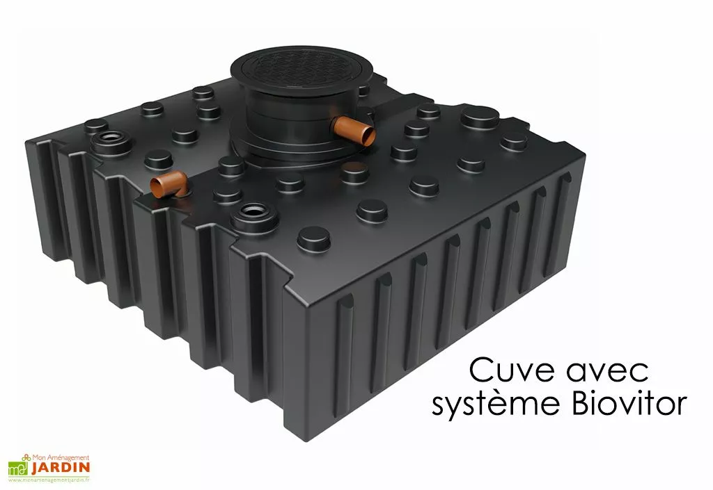 Cette citerne est fabriquée en Allemagne. Elle comprend 3 raccords DN 100 pour l’arrivée d’eau, le trop-plein et la sortie. Vous pouvez choisir une version seule ou avec filtration Biovitor.