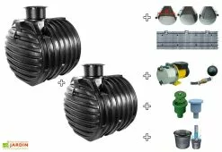 Votre kit de récupération d’eau de pluie de chez GreenLife contient 2 récupérateurs d’eau de 6000 litres (soit 12 000 litres au total). Ces deux cuves sont en polyéthylène et renforcées par la présence de dômes et de couvercles de sécurité. De plus elles sont construites en une seule pièce pour éviter la présence de soudure. Le kit vous permet d’arroser votre jardin avec l’eau de pluie. Ce kit comprend aussi une pompe auto-amorçante d’une capacité de refoulement de 38 mètres et d’un débit de 50 litres / minute, un stabilisateur d’alimentation, un tuyau d’aspiration de 5 m muni d’un filtre et d’un flotteur, un treillis de gouttière et un boitier de branchement de l’eau. Tous ces accessoires, garantis deux ans, vous permettent d’arroser votre jardin à l’aide de l’eau de pluie récupérée dans les cuves. Les cuves de qualité allemande sont garanties 15 ans. Votre cuve vous sera livrée face à votre domicile. Prévoir du matériel ou des personnes lors de la livraison car le transporteur peut vous solliciter pour le déchargement.