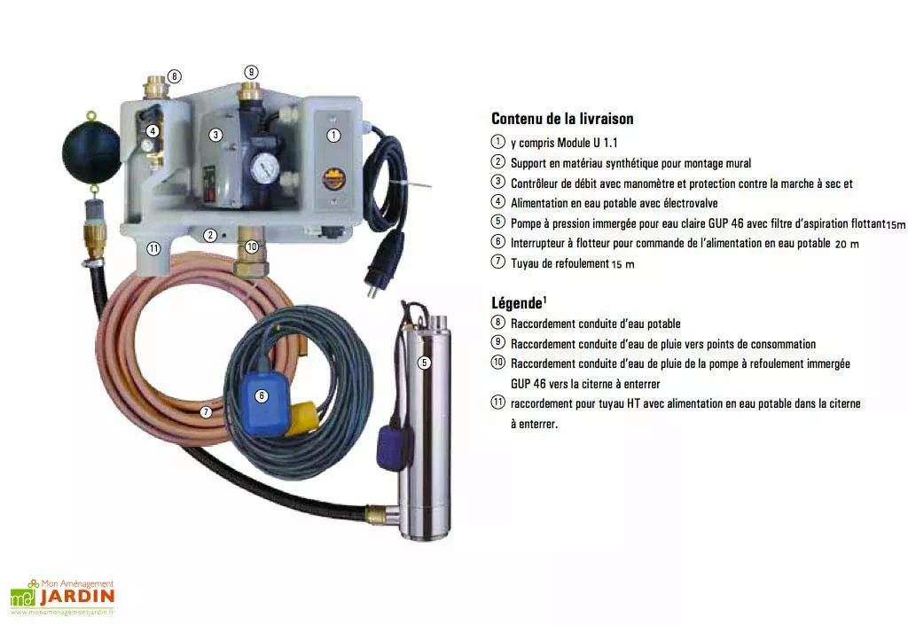 Votre kit Maison et jardin U1.1 est livré avec une notice de montage et une garantie de 2 ans (la cuve récupération d’eau de pluie n’est pas livrée avec ce kit).