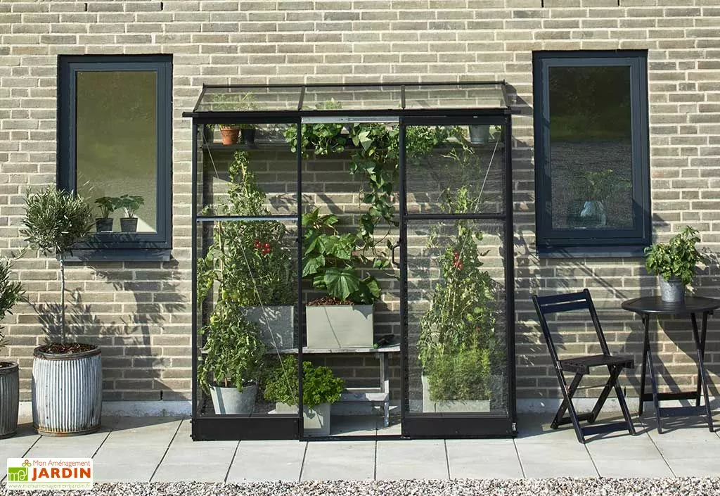 Cette serre murale associe une structure en aluminium à des parois en verre trempé de 3 mm d’épaisseur. Robuste et insensible à la rouille, même sans traitement ni entretien, l’aluminium est le métal idéal pour une utilisation en extérieur. Les vitrages en verre trempé se chargeront pour leur part de garantir une transmission de la lumière naturelle non altérée et une bonne conservation de la chaleur. Ils se montreront enfin plus solides que les vitrages en verre horticole traditionnel.