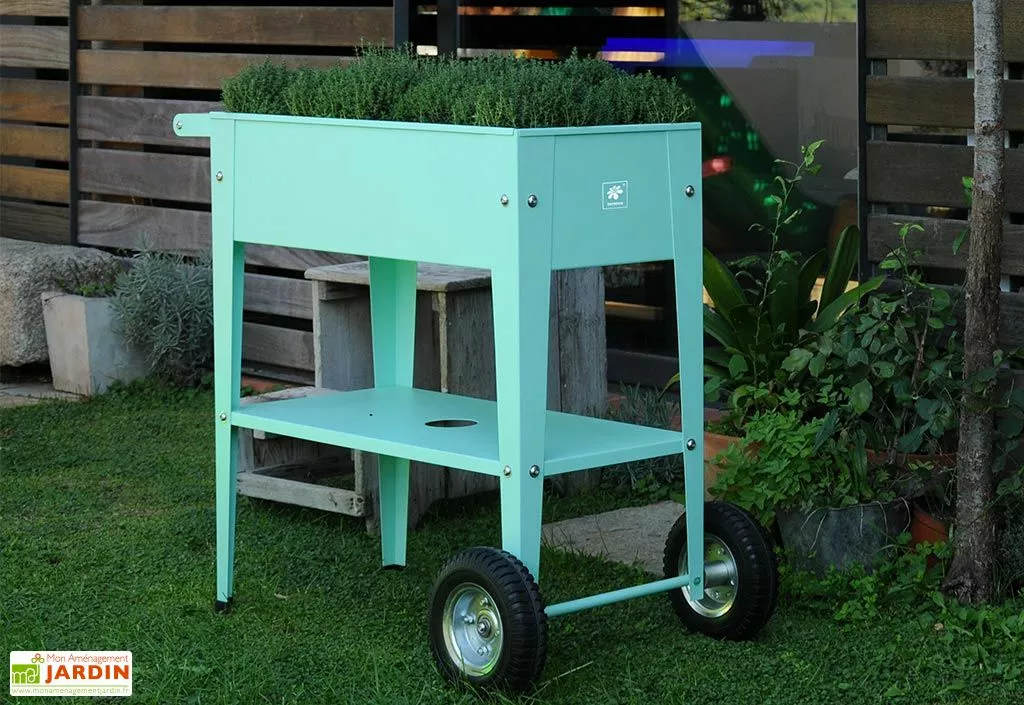 La jardinière sur pieds possède deux roues ainsi qu’une poignée en bois pour que vous puissiez la déplacer facilement au gré de vos envies.