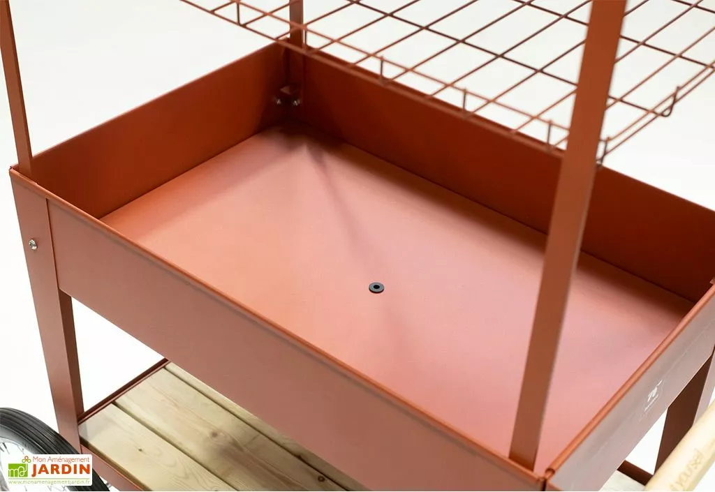 La jardinière surélevée est en acier galvanisé recouvert d’une peinture poudre qui la maintient en éclat face aux intempéries pour une utilisation possible toute l’année. Elle est bien sûr résistante à la rouille. Son bac est conçu de sorte à drainer l’eau superflue grâce à une petite ouverture en caoutchouc.