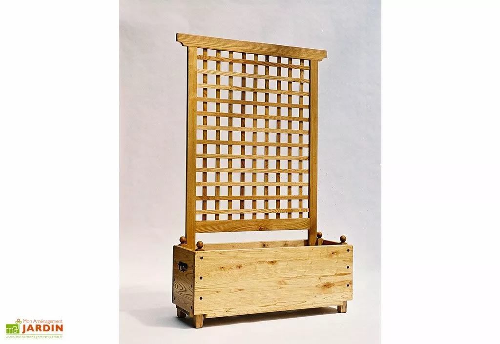 Ce bac à fleurs de la collection Renaissance du fabricant français Jardi-Bois vous permettra de cultiver des plantes grimpantes grâce à son treillis doté de mailles carrées. Il est entièrement fabriqué en bois de châtaignier dans un coloris naturel. Le bois de châtaignier est naturellement imputrescible, mais il est tout de même doté de deux couches de lasure pour une résistance accrue contre les agressions extérieures.
