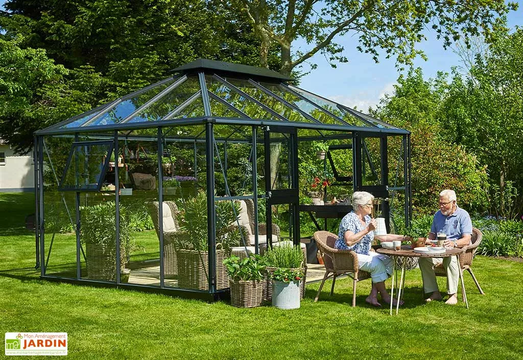Le jardin d’hiver Juliana Grand Oase offre 13 m² de surface vous permettant d’installer un salon de jardin, d’en faire une salle de repos, un atelier de peinture ou de vous en servir comme serre de jardin. Il comprend une structure en aluminium, recouverte d’une peinture appliquée par poudrage. La peinture est gris anthracite et noire, pour offrir un look contemporain à l’ensemble. Les panneaux de côté et de toit sont en verre trempé de 3 mm d’épaisseur.
