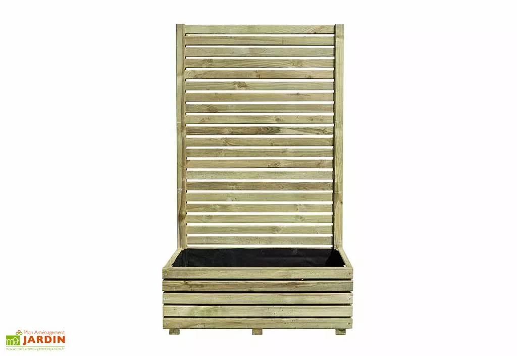 Cette jardinière signée Jardipolys prend la forme d’un bac à fleurs rectangulaire de 80 cm de large sur 40 cm de profondeur complété par un treillis de 133 cm de haut, idéal pour les espèces grimpantes. Le tout est fabriqué en bois et ne vous demandera aucun traitement ou entretien.
