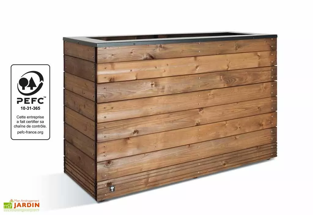 Le bac à fleurs Selekt (120x45x76) de chez Jardipolys est en bois de pin traité autoclave de classe 3. Il est teinté en brun et ne demande aucun entretien particulier de votre part. Fabriqué en France, il est également certifié PEFC, pour une utilisation du bois issu de forêts gérées durablement.