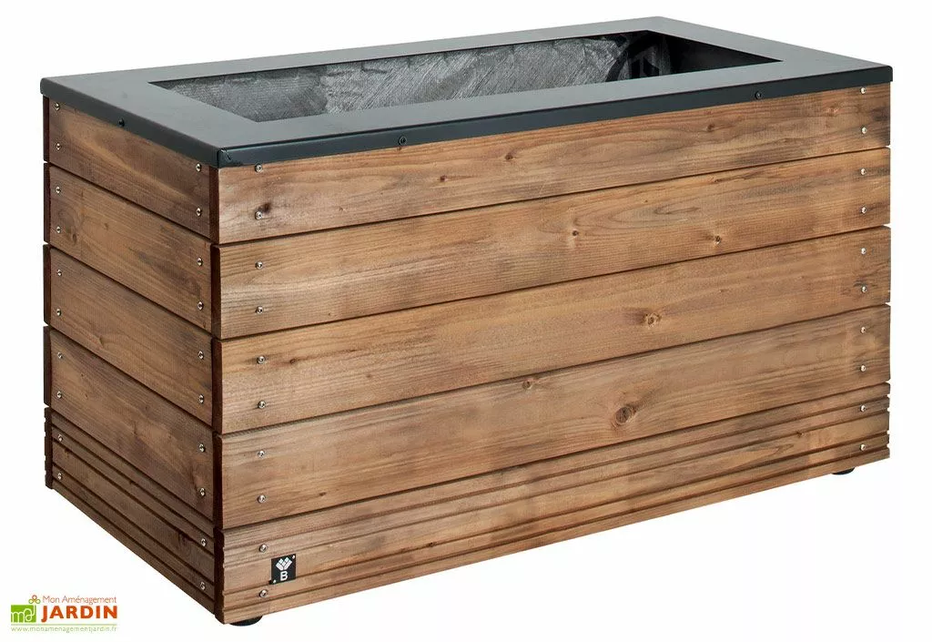La jardinière Selekt de chez Jardipolys est en bois traité autoclave de classe 3 et certifié FSC, issu de forêts gérées durablement. Le bac à fleurs ne craint pas la moisissure ni l’attaque des insectes et ne demande pas d’entretien particulier. Il mesure 90 x 45 x 47,5 cm (l,l,h) de dimensions extérieures. Ce pot de fleurs possède de beaux rebords métalliques thermolaqués noirs de 90 mm de largeur. Ils lui apportent une finition très moderne qui ne craint ni la rouille ni la corrosion.