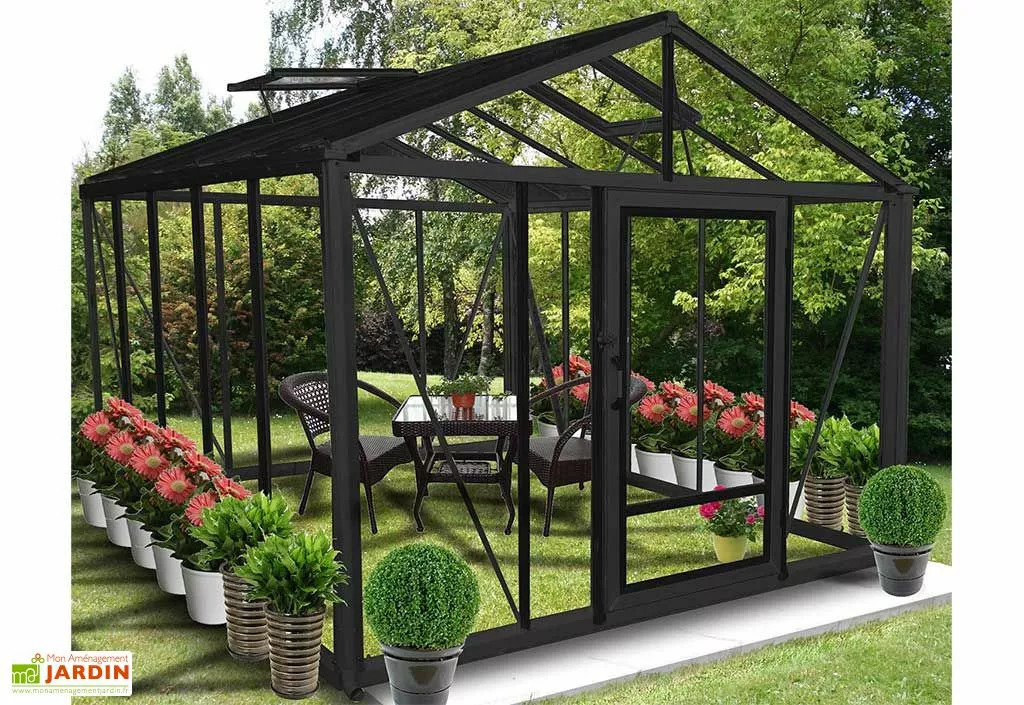 Cette serre en verre mobilise une structure en aluminium, un matériau parfait pour l’extérieur puisqu’insensible à la corrosion. Cette structure est disponible dans différents coloris (voir plus bas) et repose sur une embase, elle aussi conçue en aluminium. Cette dernière permet non seulement de faciliter le montage de la serre, mais elle en assure également la bonne stabilité tout en évitant que les parois ne soient en contact direct avec le sol.