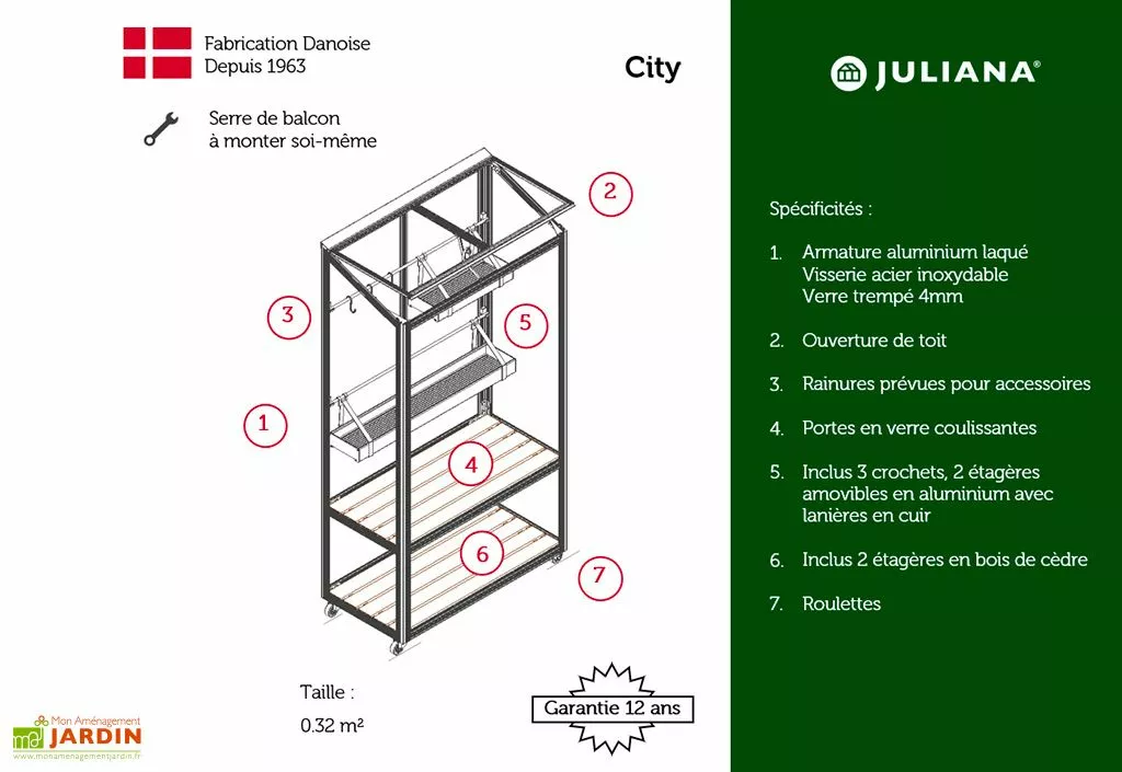 La mini serre de balcon Juliana City trouvera parfaitement sa place sur le balcon ou sur une petite terrasse grâce à ses dimensions compactes. En effet, elle mesure 40 cm de profondeur, 80 cm de largeur et 158 cm de hauteur. Elle prend peu de place et vous permet de protéger vos plants ou vos semis des intempéries.