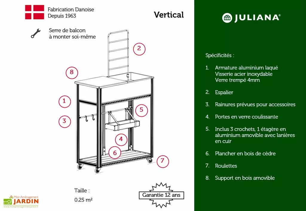 Cette petite serre 2 en 1 Juliana Vertical est composée d’une mini serre en partie inférieure et d’une table de jardinage en partie supérieure. Sa structure est en aluminium, les parois sont en verre trempé et les plateaux sont en bois de Cèdre du Canada.