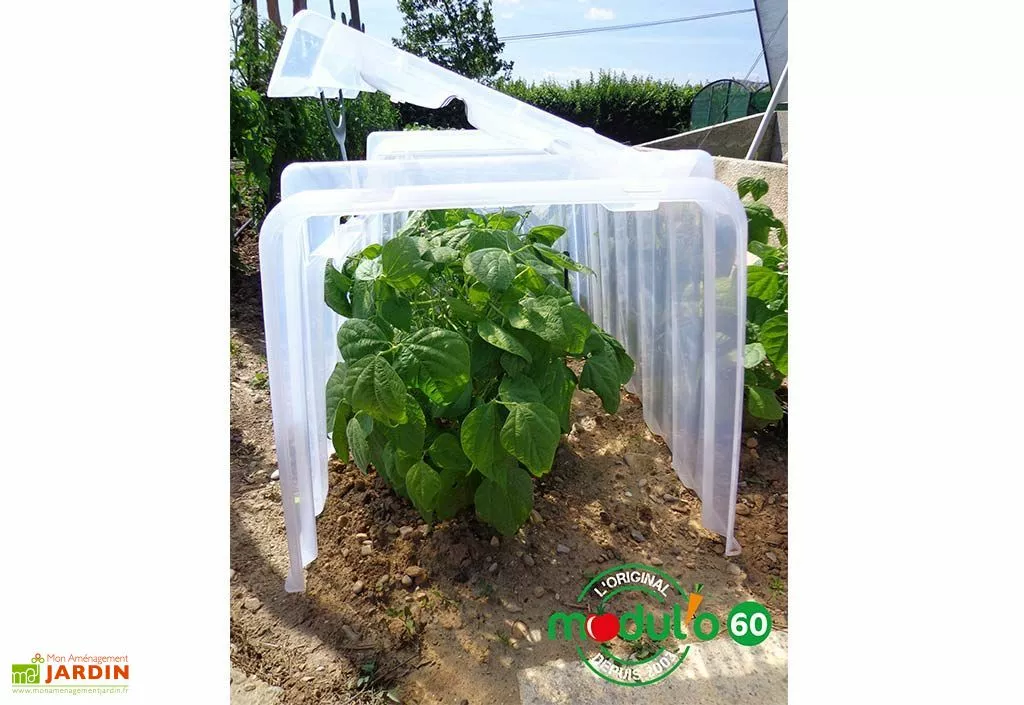 La serre de jardin Tunnel de Culture Modulo 60 Pouss’vert de chez Modul’o en polypropylène translucide, permet d’aider à la culture et au forçage de tous types de plantations. Elle est composée de 3 bases tunnel de 79 cm de longueur, 59 cm de largeur et 50 cm de hauteur, de 2 embouts et de 10 piquets en polyamide.Â