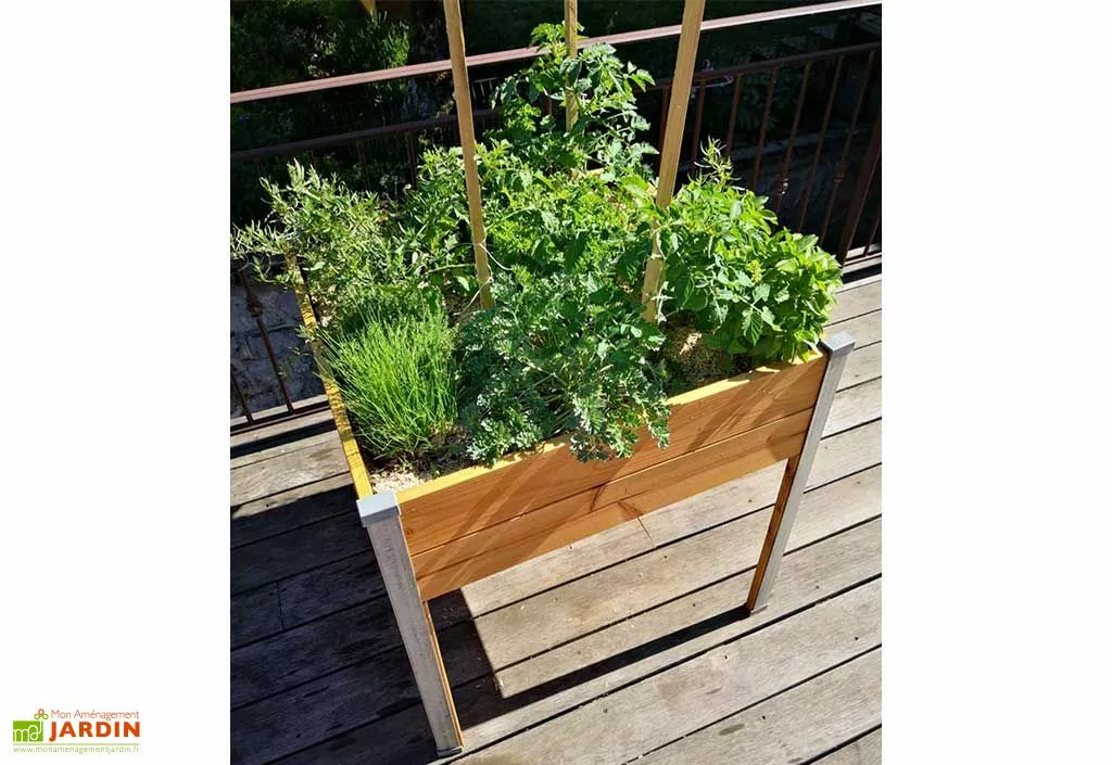 Très stable, ce carré potager dispose d’un piètement en aluminium, un matériau intéressant car naturellement insensible à la corrosion. Le prolongement de ces pieds fait office de renforts au niveau des angles, ce qui permet d’assurer la bonne tenue de l’ensemble. Il comprend également des capuchons en PVC recyclé. Notez que ce potager sur pied est livré en kit (montage facile, sans outils), accompagné d’un feutre de protection.