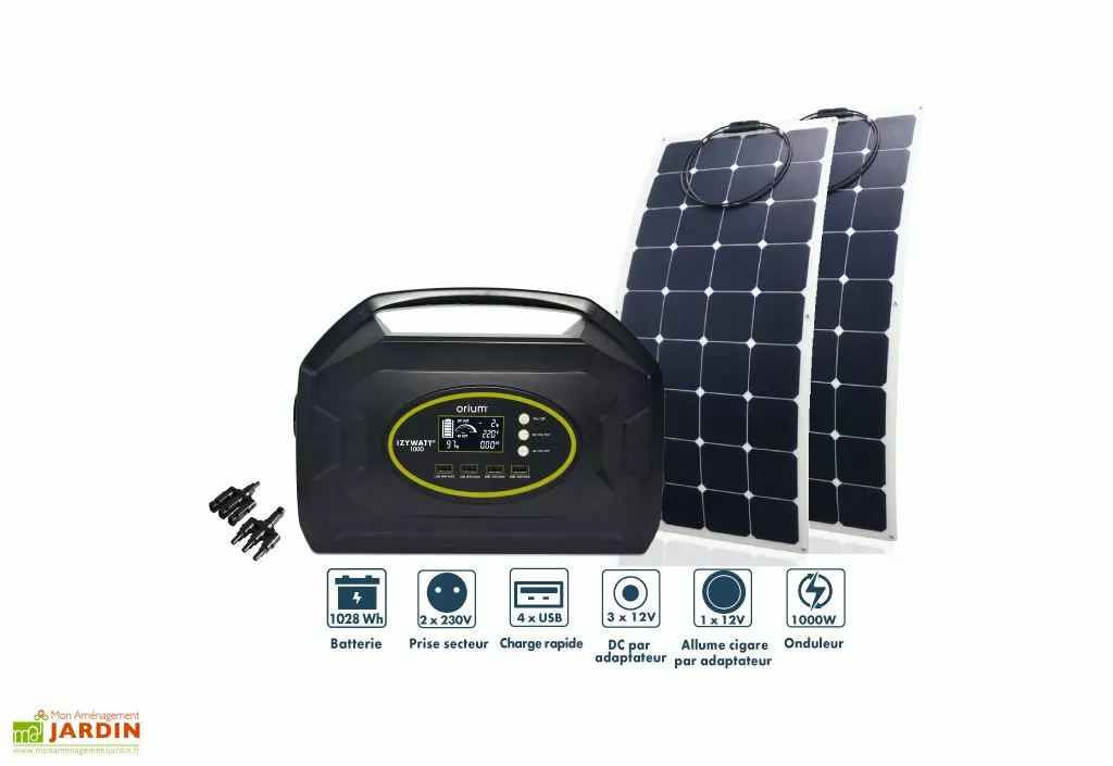 Le groupe électrogène solaire développé par Orium comprend la batterie nomade Izywatt 1000 et 2 panneaux solaires souples de 120 W. Il vous permet de profiter d’un accès à l’électricité où que vous soyez pour recharger et alimenter vos appareils 5 V, 12 V et 230 V.