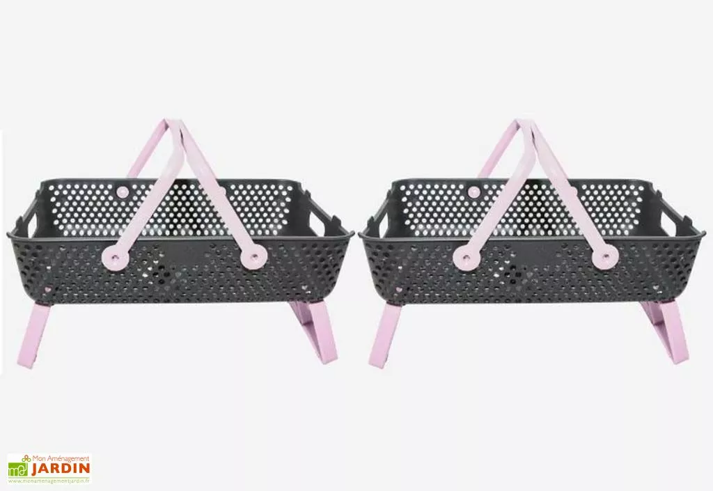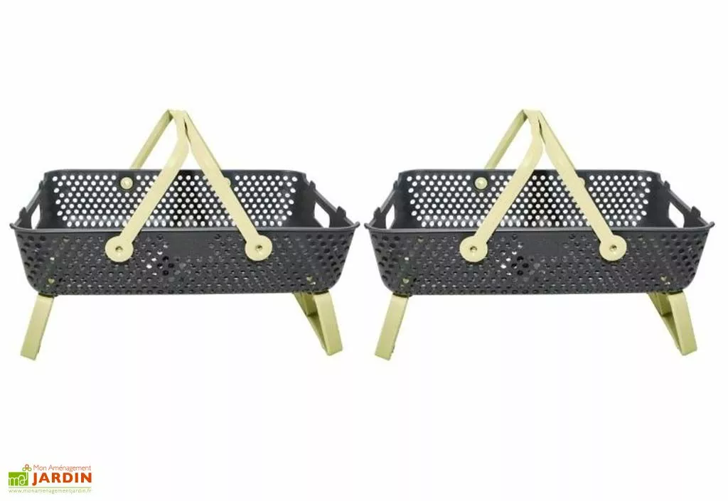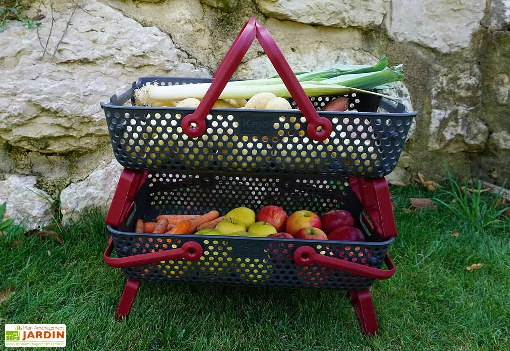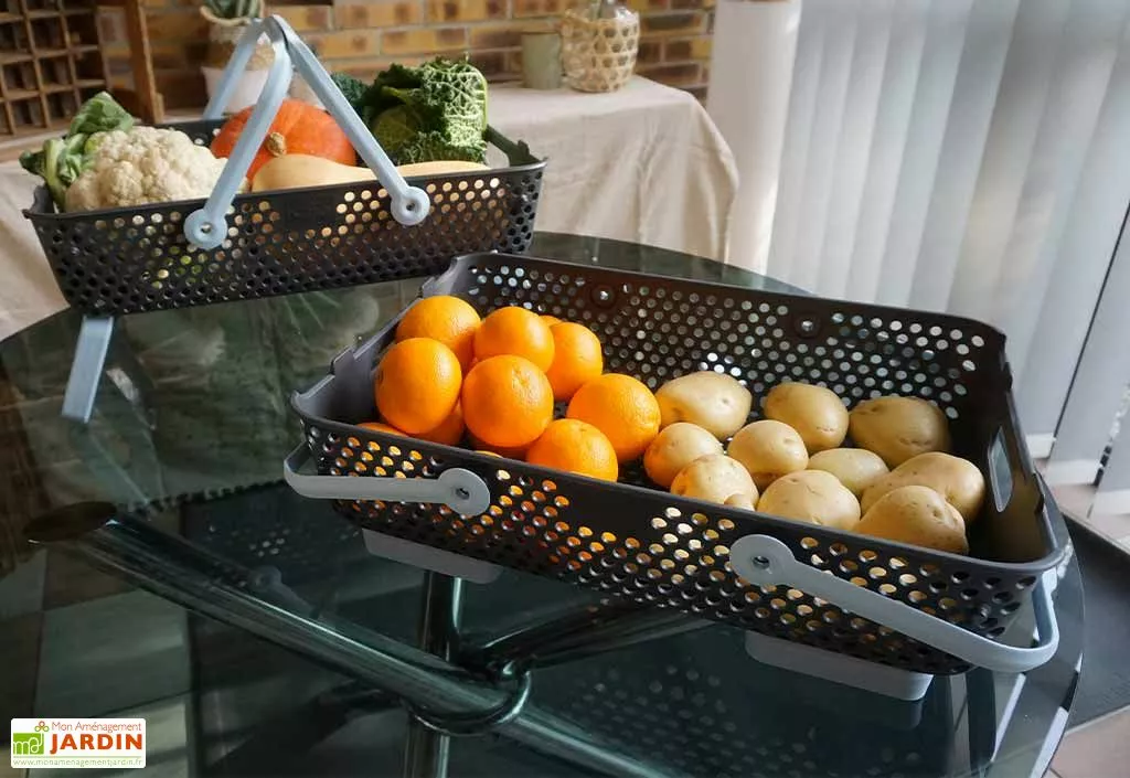 Les paniers mesurent 58 cm de longueur, 38 cm de largeur et 15 cm de hauteur (pieds repliés). Ils vous permettent de récolter vos fruits et légumes et d’éviter les manipulations. Ils s’installent également dans la cuisine pour les stocker.