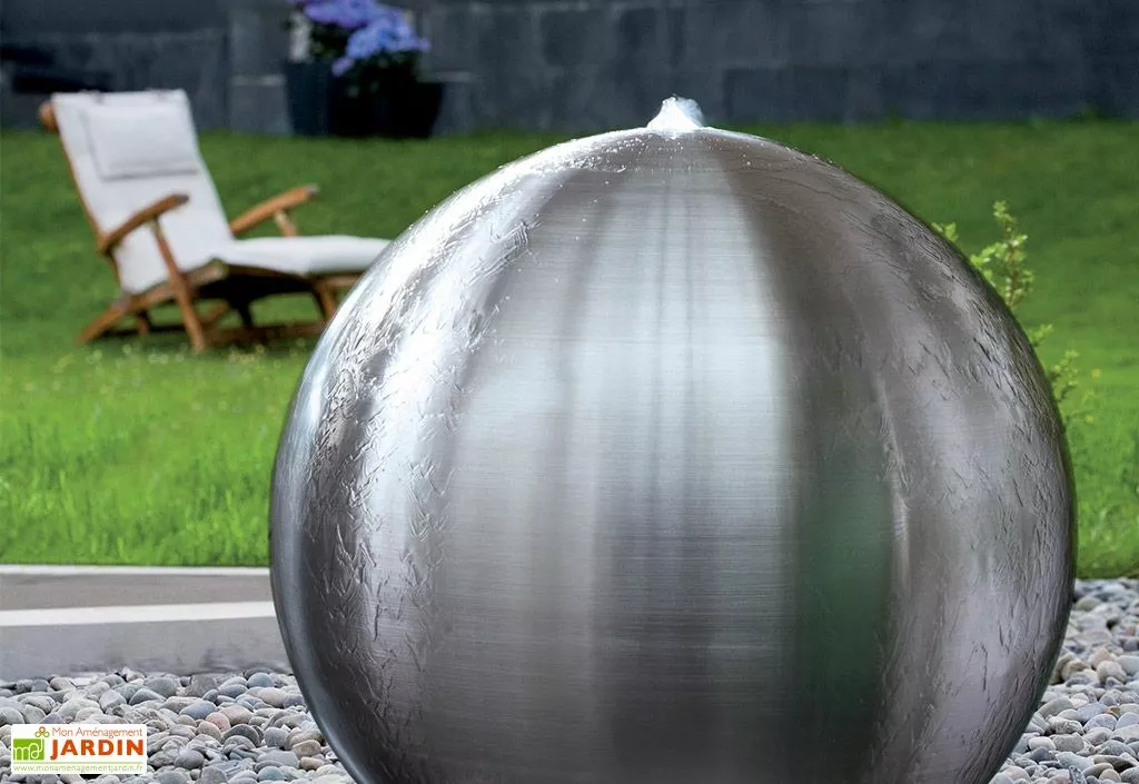 Cette fontaine de jardin intègre une pompe (longueur du câble d’alimentation : 10 m) ainsi qu’un système d’éclairage à LED lui permettant de prendre une toute autre dimension une fois la nuit tombée. La boule métallique qui compose cette fontaine d’extérieur repose sur un socle faisant office de bassin, avec une grille de protection.