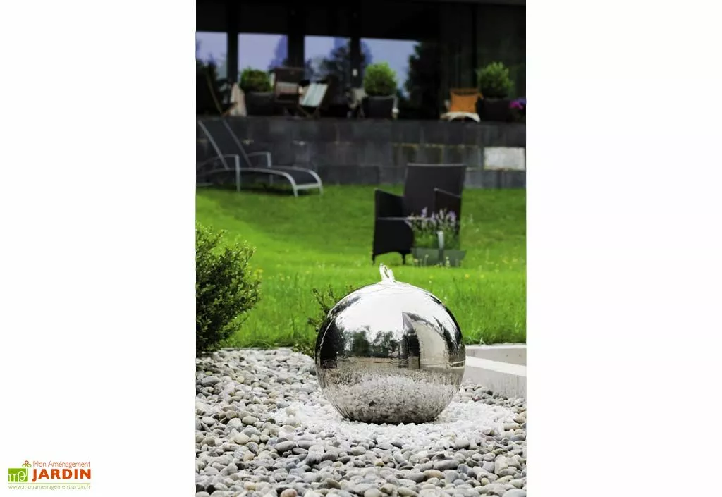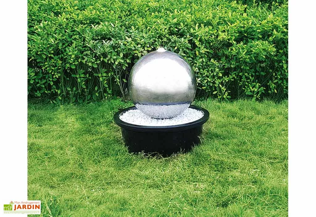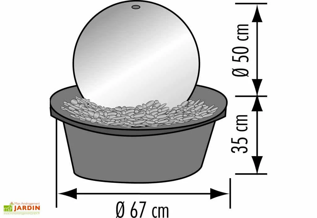 La fontaine est équipée d’une pompe à débit variable avec un câble de 10 m. Le socle, en plastique, a un diamètre de 67 cm. Le diamètre de la boule est de 50 cm. Un éclairage LED permet d’éclairer votre fontaine dans la nuit.