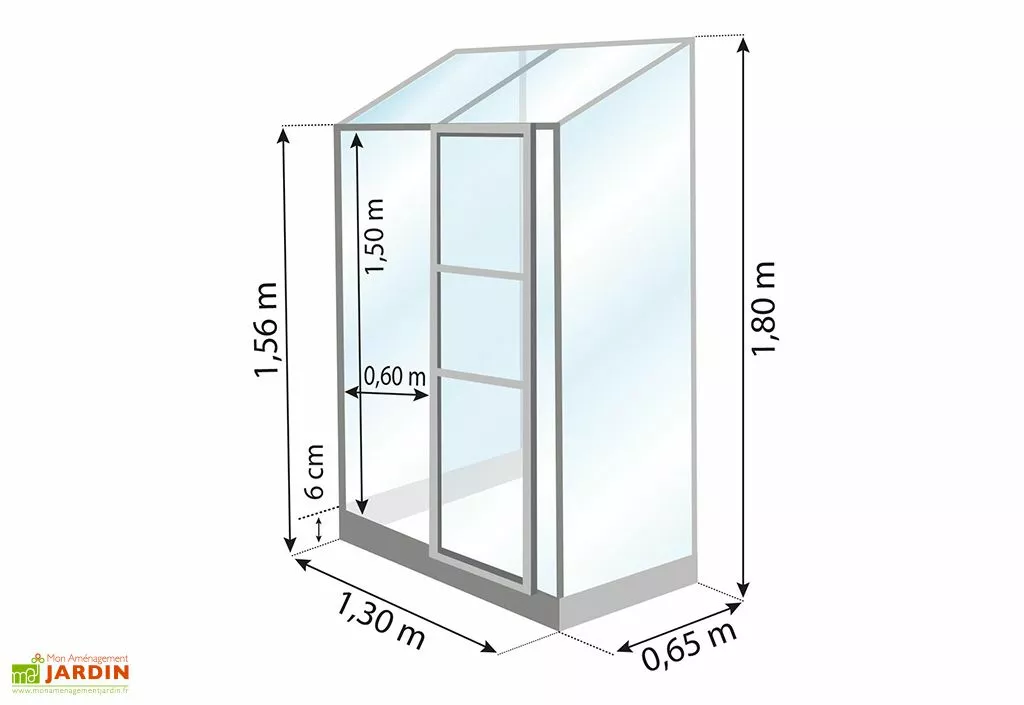 La serre de jardin de chez Lams est une petite serre adossée offrant une surface inférieure à 1 m², idéale pour les petits espaces : terrasses, petits jardins, balcons… Elle mesure 65 cm de profondeur pour une longueur de 130 cm (au sol) et une hauteur de 180 cm. Ses dimensions hors tout sont de 77 x 131 cm.