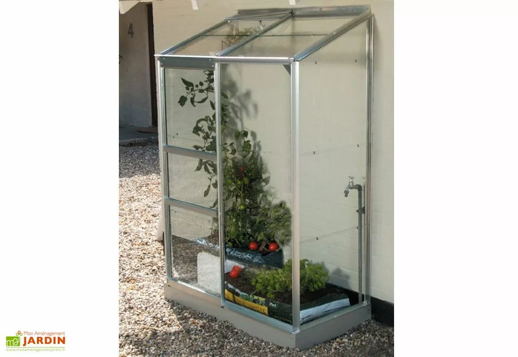 La petite serre adossée dispose d’une gouttière permettant de récupérer l’eau de pluie et d’une base en acier galvanisé de 6 cm de hauteur. Cette base vous permet d’installer la serre directement sur la terre ou sur la pelouse sans avoir à créer de dalle de béton. Le sol doit être de niveau. La serre est livrée en kit, facile à monter grâce à une notice de montage détaillée.