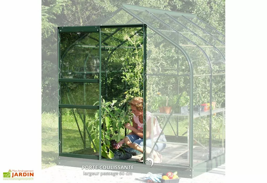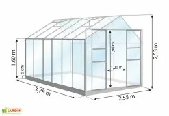 La serre en aluminium mesure 3,80 m de longueur, 1,93 m de largeur et 2,08 m de hauteur et vous offre ainsi une surface de 7,33 m² pour cultiver vos plants et forcer vos semis. Une porte coulissante de 60 x 160 cm (l,h) vous permet d’accéder facilement à l’intérieur. Couplée à la lucarne de toit incluse, elle vous permet d’aérer facilement et créant un courant d’air. Vous contrôlez ainsi la température et l’humidité facilement.