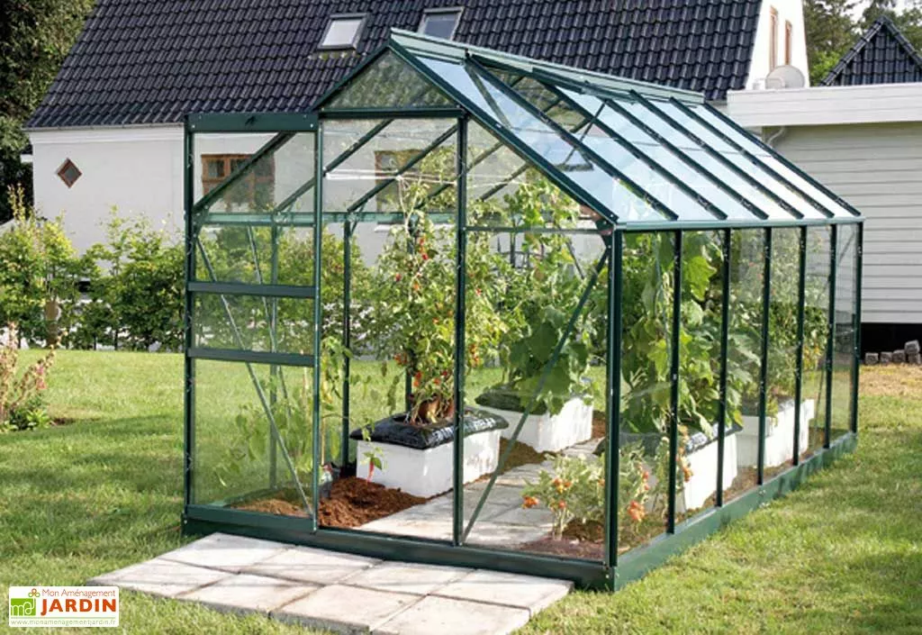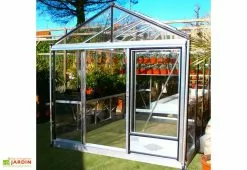 La serre de jardin de chez Lams est une serre en aluminium qui s’intègre parfaitement dans le paysage grâce à son laquage vert. L’aluminium est un matériau résistant, qui ne demande aucun entretien, puisqu’il ne craint pas la moisissure, les insectes ni la corrosion. Les parois sont en verre trempé de 3 mm d’épaisseur, un matériau résistant aux chocs, aux rayures et chocs thermiques. Il permet à la lumière de pénétrer à plus de 90% à l’intérieur de la serre.