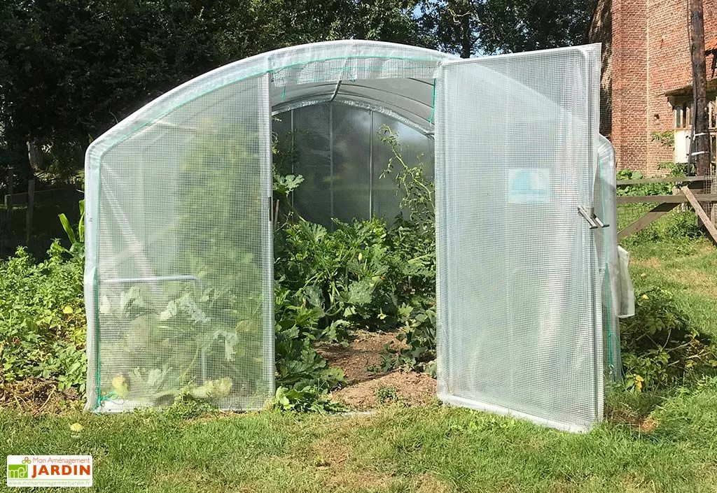 La serre de jardin en polyéthylène est équipée d’une porte pivotante de 1 m de largeur. Vous pourrez trouver une porte supplémentaire à installer à la place du pignon arrière, dans votre rubrique accessoires. Dans vos options vous avez le choix parmi une serre avec ou sans aération. Si vous choisissez la version avec aération, deux manivelles de relevage vous sont fournies, vous permettant de remonter les deux côtés de la bâche sur 70 cm.