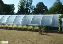 La serre tunnel dispose d’une armature tubulaire en acier galvanisé. Les tubes mesurent 30 mm de diamètre et 1,5 mm d’épaisseur. La structure est couverte d’une bâche en polyéthylène 200 microns transparente. Elle permet de laisser passer 92% de la lumière naturelle pour une excellente transmission lumineuse à l’intérieur de la serre. Les pignons avant et arrière sont, quant à eux, équipés d’une bâche en PVC armé 400 microns.