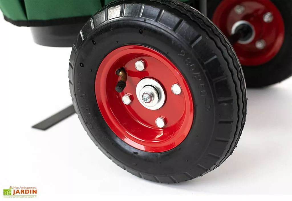 Ce chariot représente un assistant qui vous aidera lors de vos activités de jardinage. Il est pratique et se déplace sans effort même sur les terrains les plus ardus grâce à ses grosses roues qu’il vous faudra gonfler. Sa béquille lui permet de rester droit et stable quand il est à l’arrêt. Il vous épargnera bon nombre d’allers-retours entre votre atelier et votre potager !